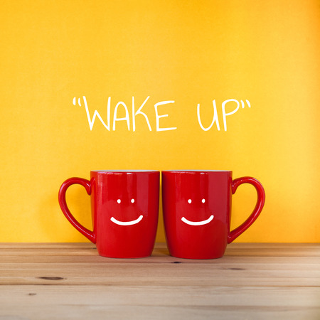 おはようの言葉します コーヒーとカップに笑顔で背景が黄色のハート形に一緒にスタンドの 2 つのカップ の写真素材 画像素材 Image